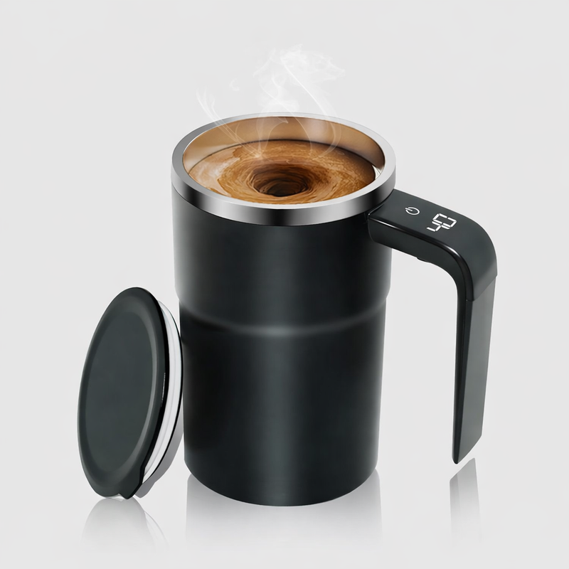 The mug uses a magnetic stirring mechanism that activates with a single button press. A magnetic stirrer inside the mug rotates to help mix beverages more easily than manual stirring.